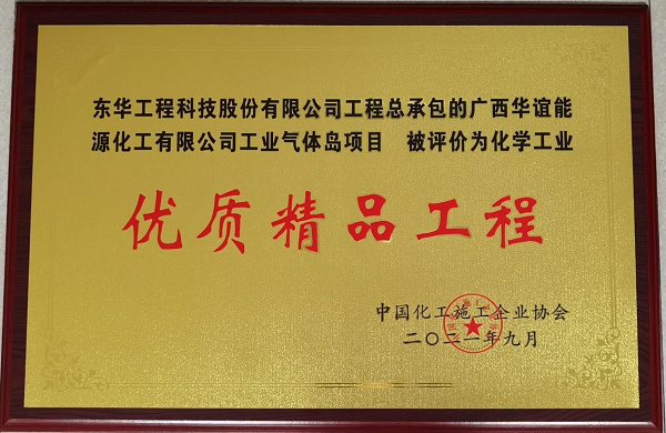 At the beginning of November 2021, the industrial gas island project of Guangxi Huayi Energy and Chemical Co., Ltd., EPC contracted by East China Engineering Science and Technology Co., Ltd., won the 2021 “Top Quality Fine Project Award of Chemical Industry” issued by China National Association of Chemical Construction Enterprise, which is the highest award for engineering quality in the national chemical industry.